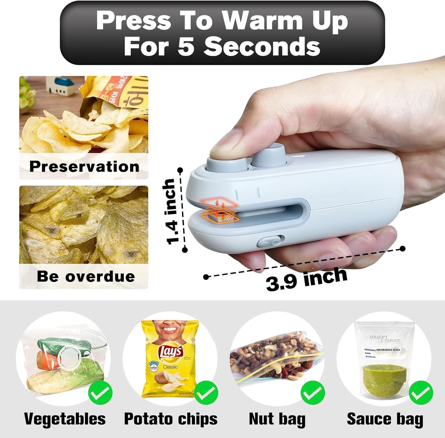 - 【2-in-1 Bag Sealer&Cutter】This mini bag sealer is a heat bag sealer, and also a bag opener. You can seal bags easily and keep your food fresh, also with the built-in sharp stainless steel blade to open the bags conveniently. 2-in-1 machine. Enjoy your fresh and crispy snacks.